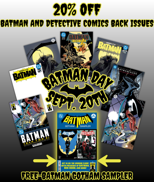 Celebrate the Caped Crusader with a Batman Day only special featuring 20% off regular priced Batman and Detective Comics Back Issues*, and grab a FREE Batman Gotham Sampler (while supplies last)!!!
